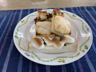 | ★マシュマロトースト @食パンを縦3等分、又は四角に4等分に切る。 A切った食パンにマーガリンを塗る。 B食パンに@のビスケットを手でちぎりながら振りかける。 Cマシュマロを半分にカットして、Bのパンの上に並べる。 Dトースターに入れ、マシュマロにこんがり焼き目を付けたらできあがり。 ※トースターの機種によって、時間が異なります。焦げやすいので気をつけて。 |